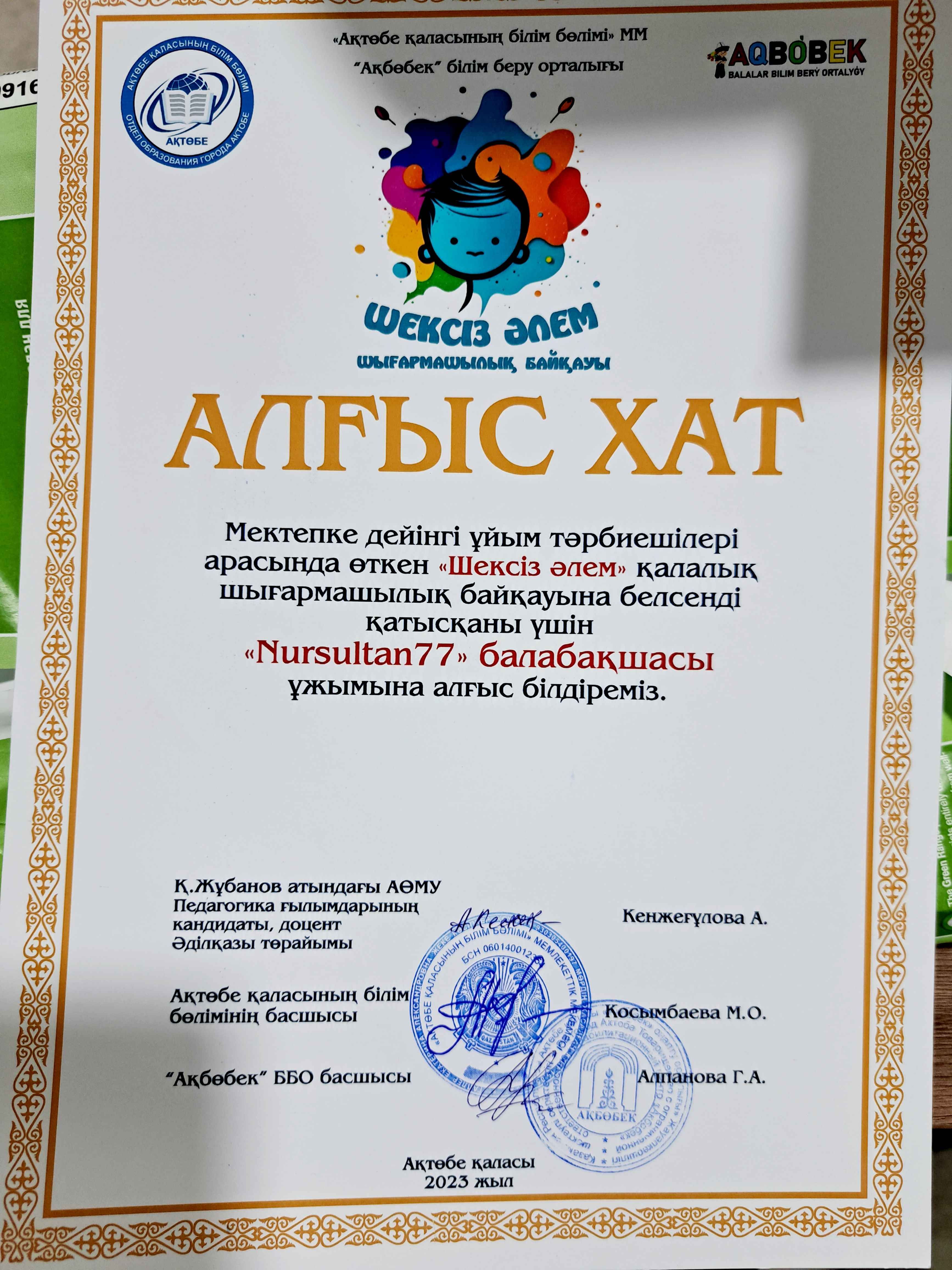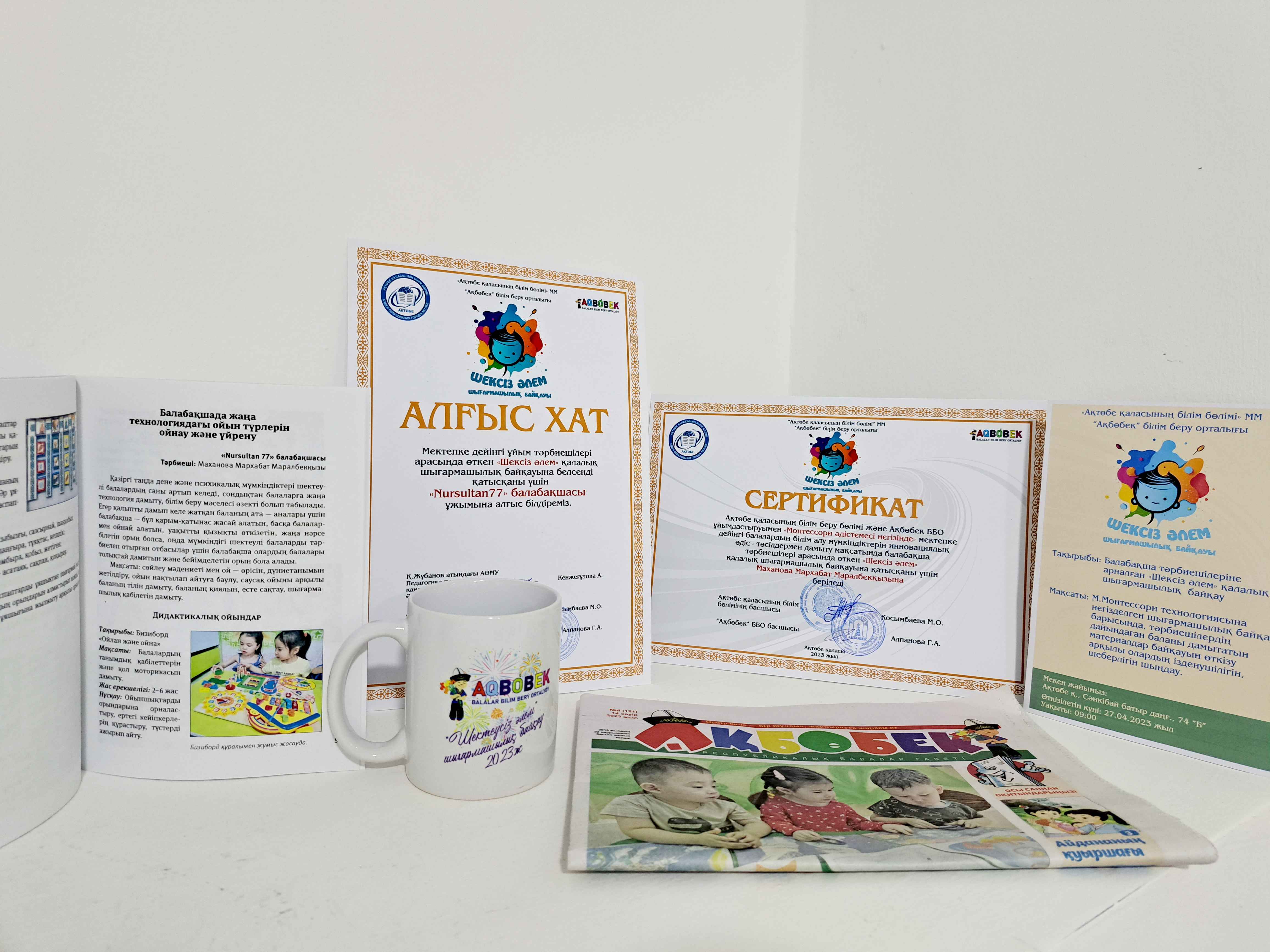 Біздің жетістіктеріміз! Ақтөбе қалалық білім беру бөлімі және Ақбөбек ББО ұйымдастыруымен "Шексіз әлем" қалалық шығармашылық байқауына қатысқаны үшін Маханова Мархаббат Маралбекқызы марапатталды.